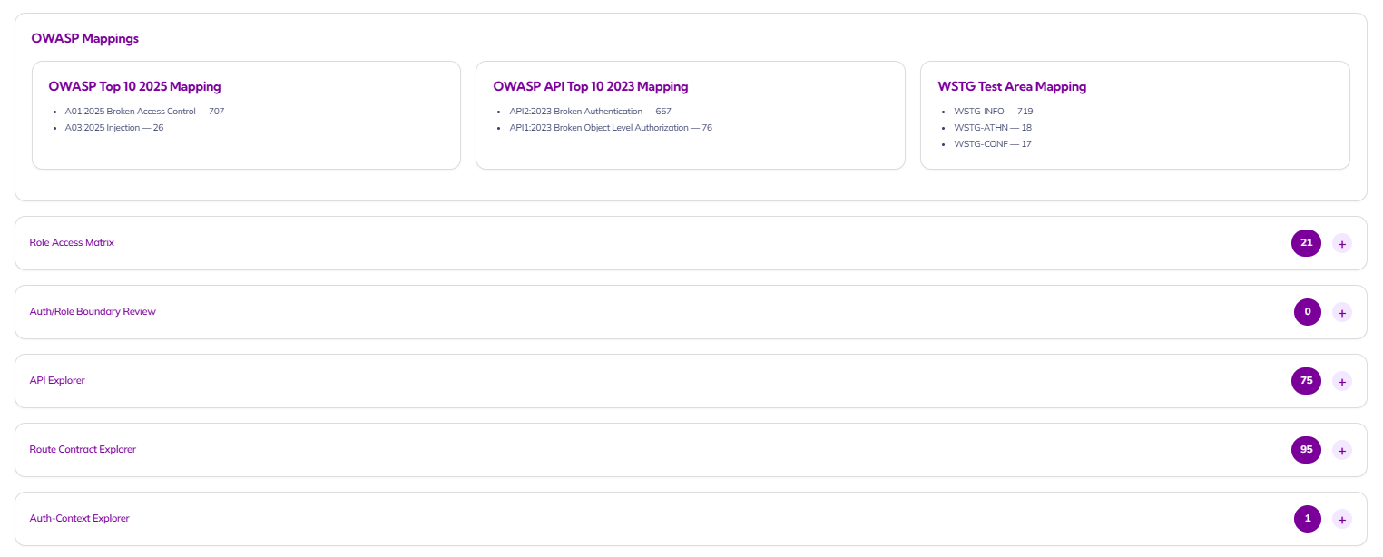 Translate technical findings into recognized security frameworks your leadership team already understands. This view maps results to OWASP Top 10, OWASP API Top 10, and WSTG test areas while also exposing role access matrices, API exploration, route contracts, and auth-context insight helping security executives communicate risk clearly and helping site owners understand where protection needs to improve.