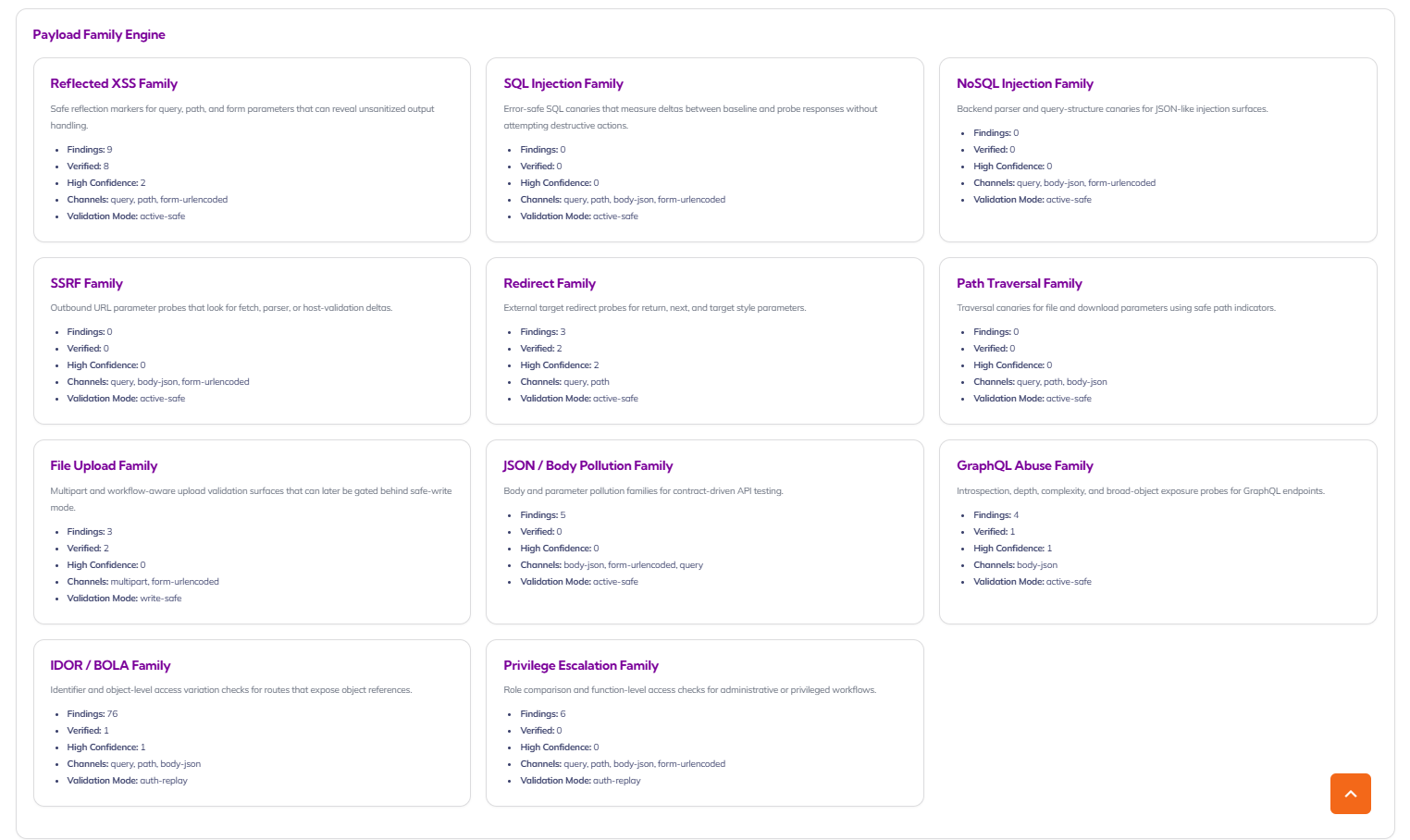 See how your application stands up against the attack patterns that matter most. The Payload Family Engine organizes results by offensive test family such as XSS, SSRF, file upload, JSON/body pollution, GraphQL abuse, IDOR/BOLA, and privilege escalation giving security teams a clearer way to understand coverage, validation mode, and the concentration of risk across modern web applications and APIs.