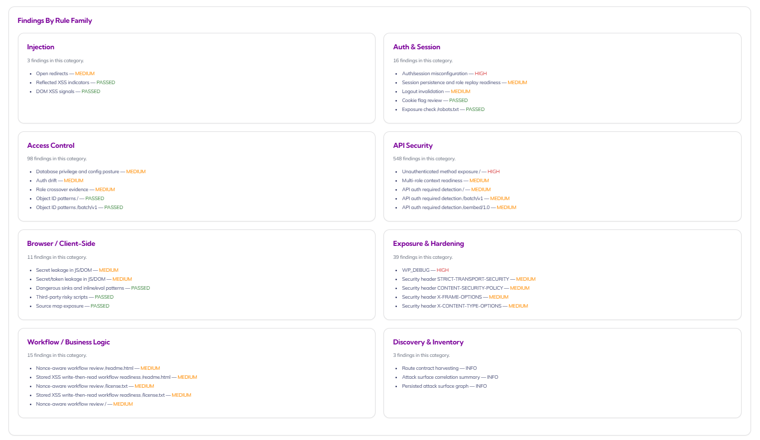Turn overwhelming scan output into structured, decision-ready intelligence. By organizing findings into rule families like Injection, Auth & Session, Access Control, API Security, Browser/Client-Side, Exposure & Hardening, Workflow/Business Logic, and Discovery & Inventory, this view helps security teams prioritize systemic weaknesses while giving site owners a clearer picture of where their application posture needs attention.