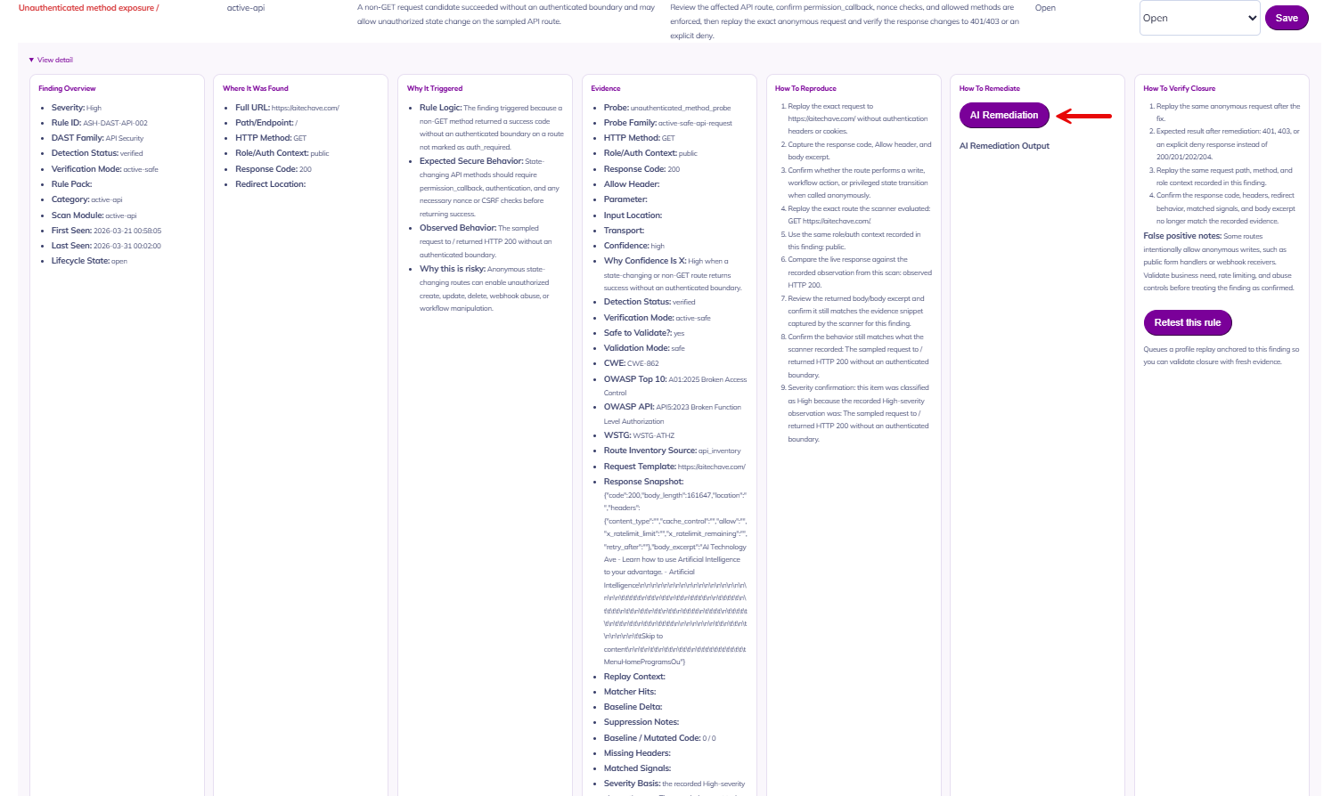 Move beyond raw findings and into real response. This detailed finding view gives executives and operators the full story behind every issue: severity, rule ID, evidence, trigger logic, reproduction steps, remediation guidance, and validation instructions while built-in AI remediation instructions helps teams accelerate closure without losing context.