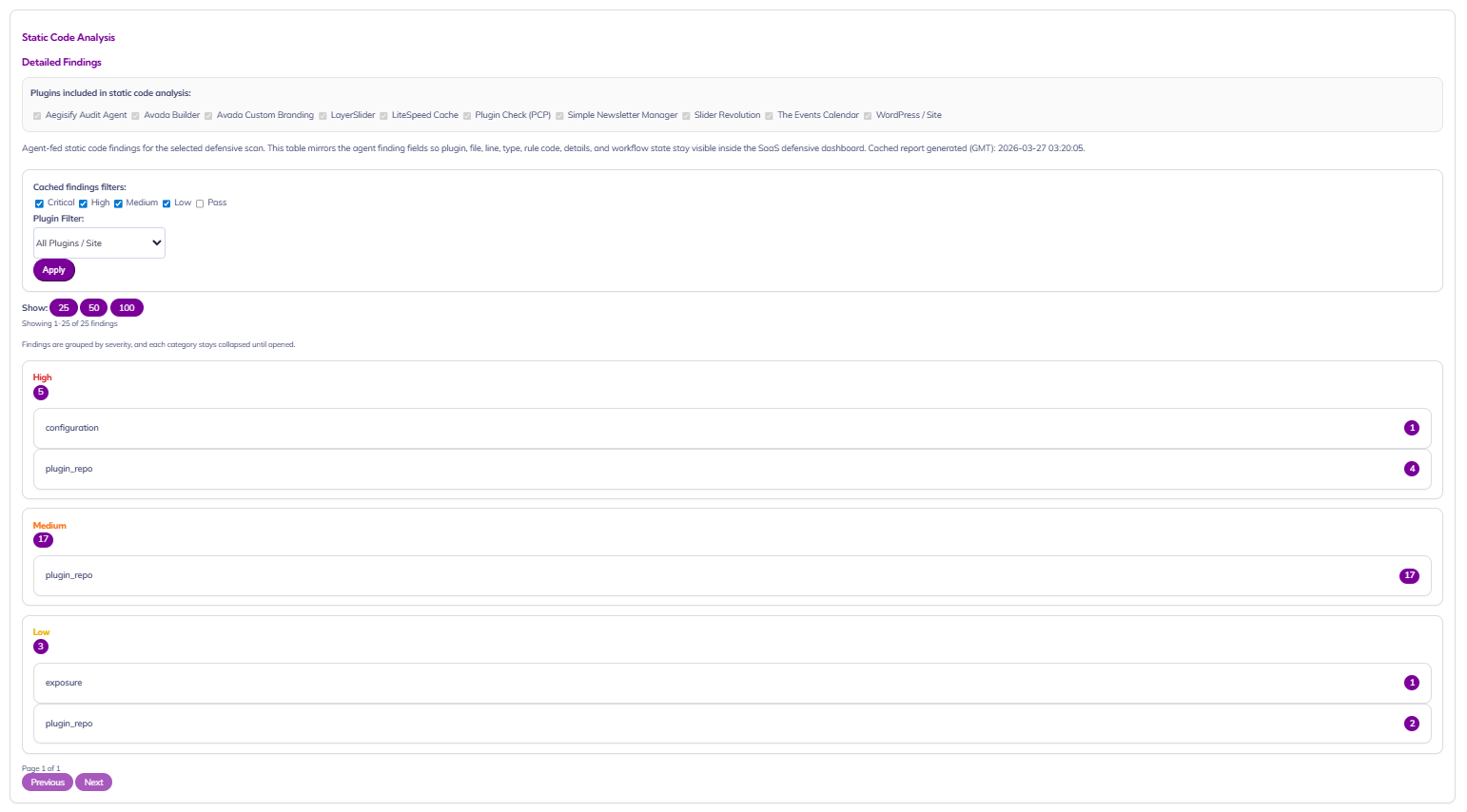 Give security executives and site owners a clear view into code-level risk across the WordPress stack. This dashboard surfaces cached static analysis findings by plugin, file, severity, and rule category, making it easier to spot weak points in site components, prioritize remediation, and maintain a stronger security posture without digging through raw technical output.