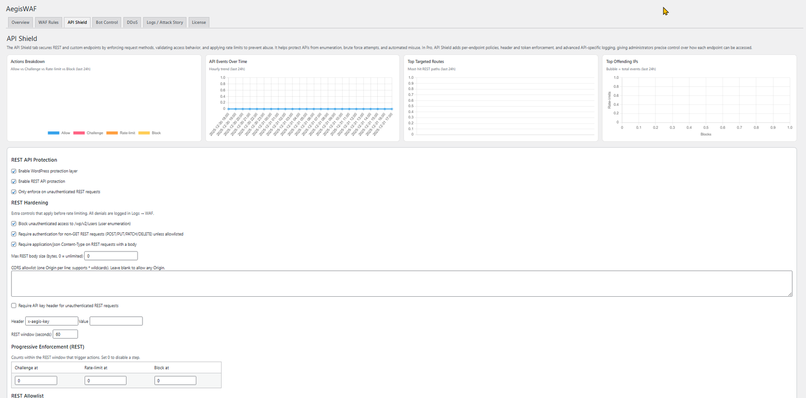 The API Shield provides granular security controls for WordPress REST APIs and sensitive application endpoints — one of the most frequently exploited attack surfaces in modern WordPress deployments. AegisWAF classifies endpoints by function, method, and risk profile, enforcing rate limits, behavioral policies, and access controls accordingly. This ensures APIs remain functional for legitimate use while preventing enumeration, abuse, and unauthorized access. For application security, this capability is essential to protecting headless WordPress sites, integrations, and custom plugin APIs.