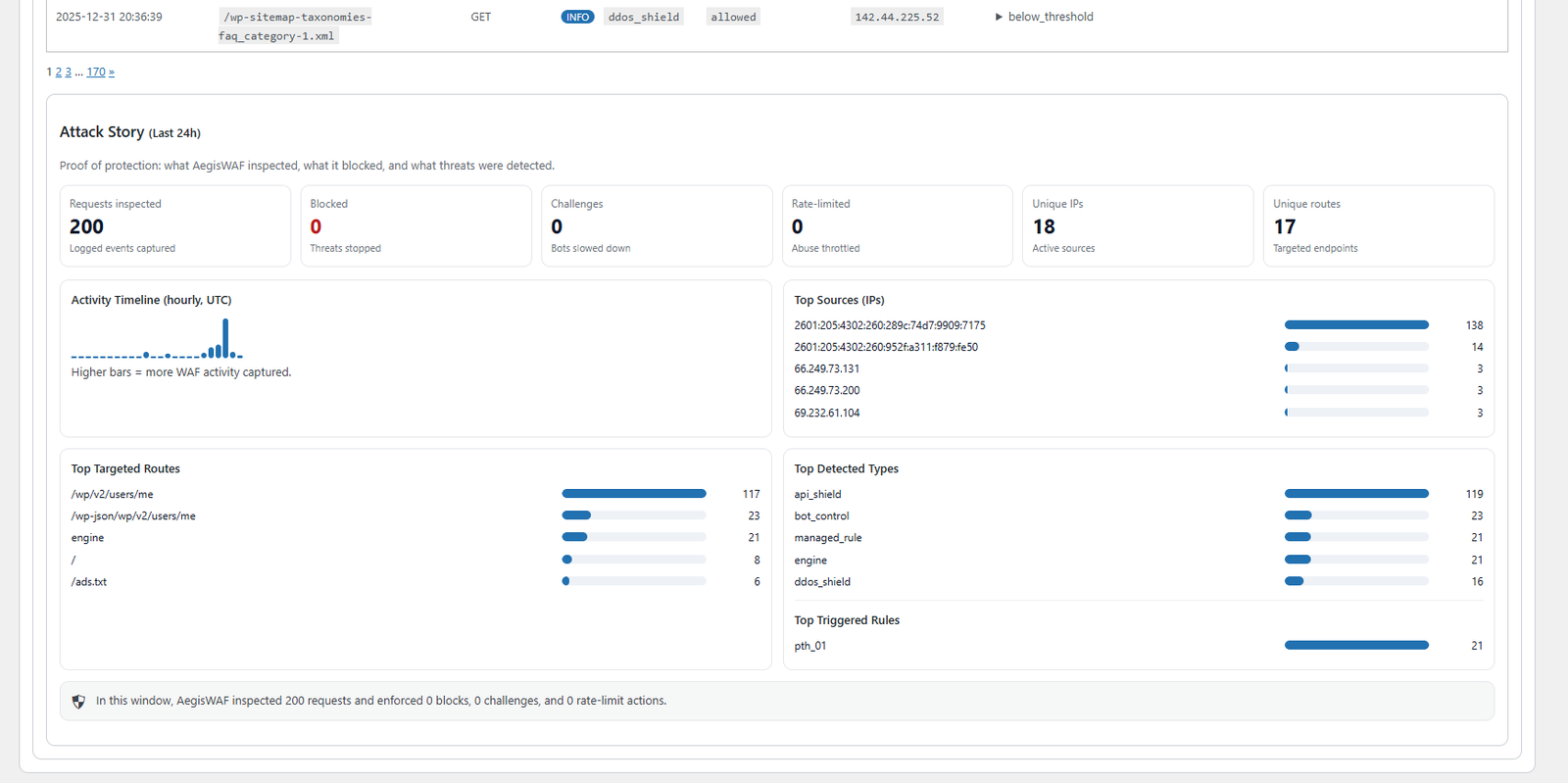 The Behavioral Timeline Engine goes beyond single-request inspection by correlating activity across time to identify attacker intent. AegisWAF constructs detailed behavioral timelines that reveal how an attacker probes, escalates, and attempts exploitation across multiple requests and endpoints. This contextual awareness allows administrators to understand how and why an attack occurred, not just that it happened. From an application security perspective, behavioral timelines dramatically improve threat attribution, response accuracy, and forensic clarity, enabling proactive defense against persistent and adaptive attackers.
