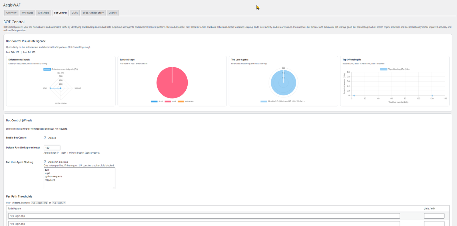 AegisWAF’s bot control system detects and mitigates malicious automated traffic, including scanners, scrapers, and credential-stuffing bots, while preserving access for legitimate users and search engines. By combining behavioral analysis, request pattern recognition, and threat scoring, AegisWAF distinguishes human traffic from automation with high accuracy. This protects application resources, reduces infrastructure strain, and prevents automated abuse that can lead to account compromise or data extraction — a critical requirement for modern WordPress sites facing constant automated threats.