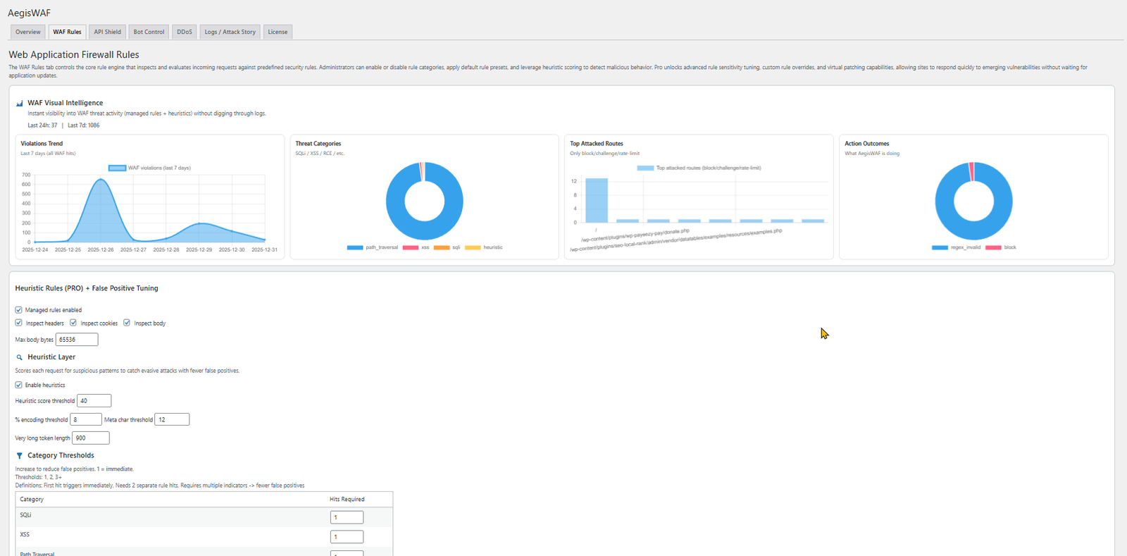 The AegisWAF inline Web Application Firewall operates at the PHP execution layer, inspecting and enforcing security controls on every incoming request before WordPress core, plugins, or themes are loaded. Unlike reactive security plugins that monitor activity after execution, AegisWAF prevents malicious requests from ever reaching application logic by normalizing request data, applying managed rules, behavioral intelligence, and heuristic scoring in real time. This approach dramatically reduces attack impact, server load, and exploitation risk by stopping threats at the earliest possible point in the request lifecycle. For WordPress administrators, this means true application-level protection that safeguards databases, authentication flows, and custom plugins from exploitation, even in zero-day scenarios.