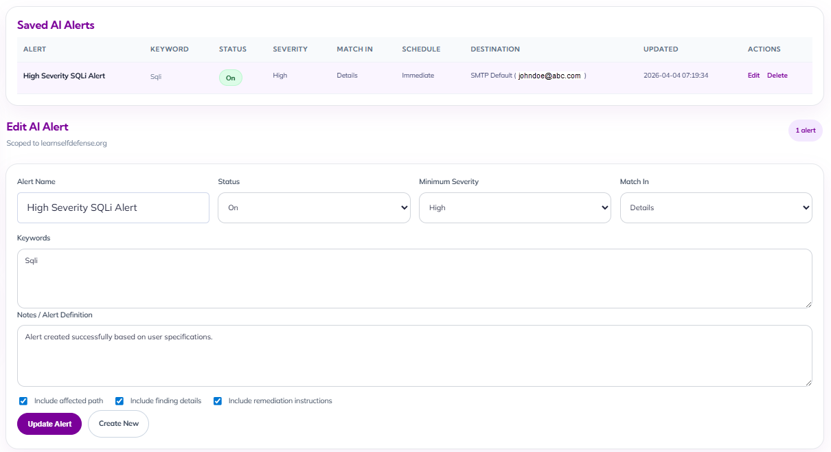 Create an alert for keyword “Sqli”, minimum severity high, match in details, and include path, finding details, and remediation instructions.