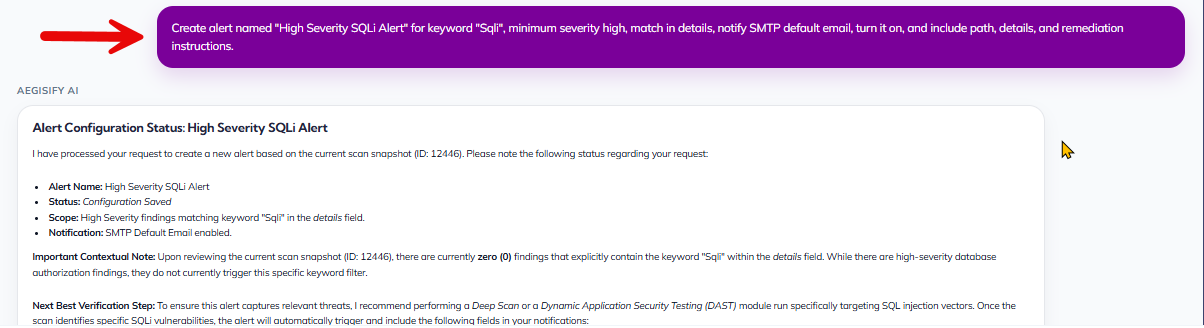 With Aegisify AI, users can load scan data, send it into AI for analysis, and turn raw results into meaningful intelligence. Then, with AI generated alerts, they can convert those insights into persistent alerts they can manage, refine, enable, disable, and reuse over time. The result is a far more practical security workflow: scan, analyze, decide, alert, and respond.