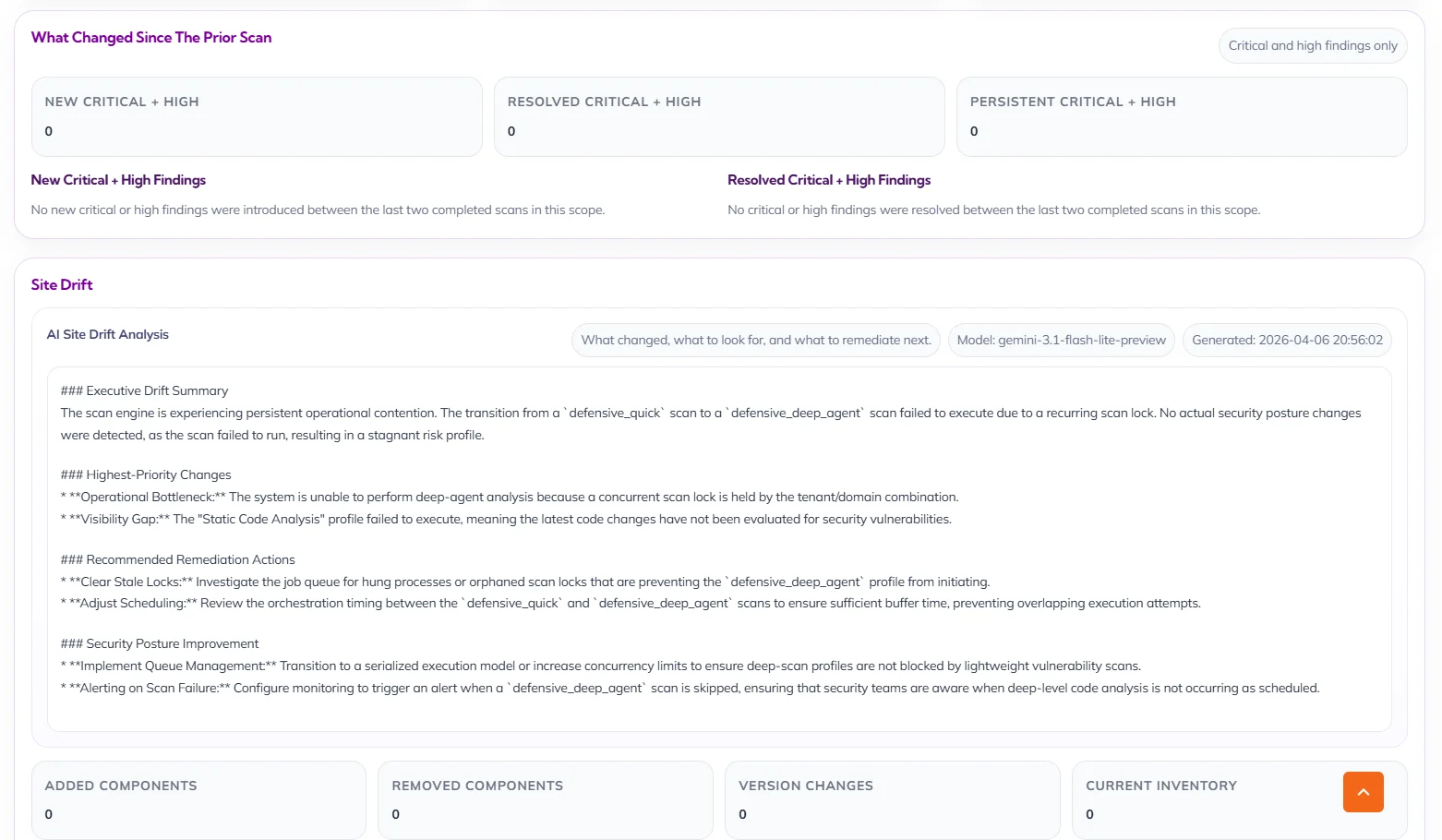 The Site Drift card is the operational change-analysis view for the selected domain. It is intended to explain how site composition, inventory, and environment movement may have changed since the prior scan, and to provide AI-assisted interpretation of what those changes mean for security and stability.
