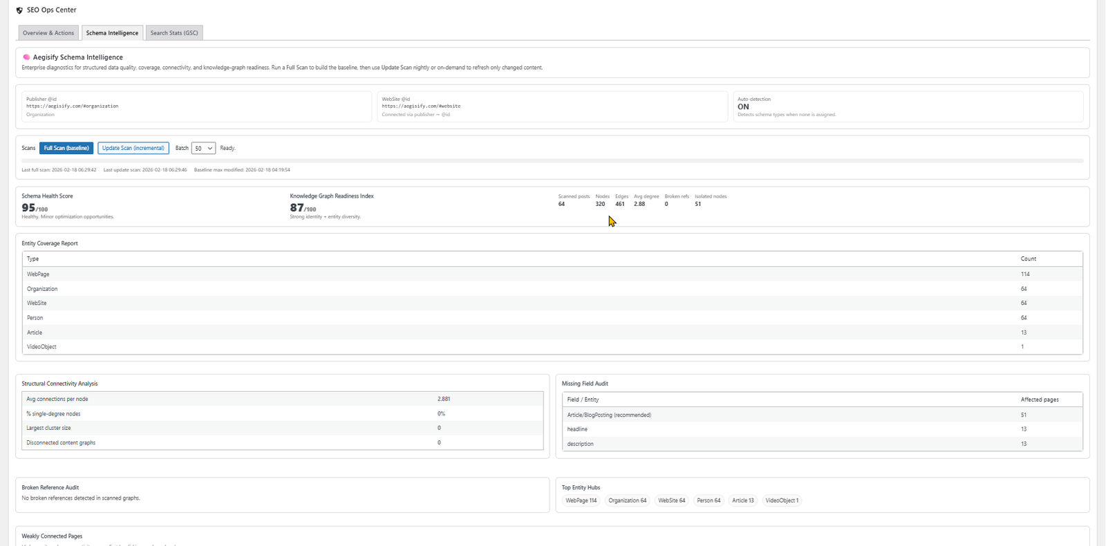 Modern SEO is no longer about keywords alone. It’s about entities, relationships, and how clearly search engines can understand your site’s knowledge graph. Aegisify SEO’s Schema Intelligence tab transforms structured data from a static feature into a live diagnostic and remediation engine.