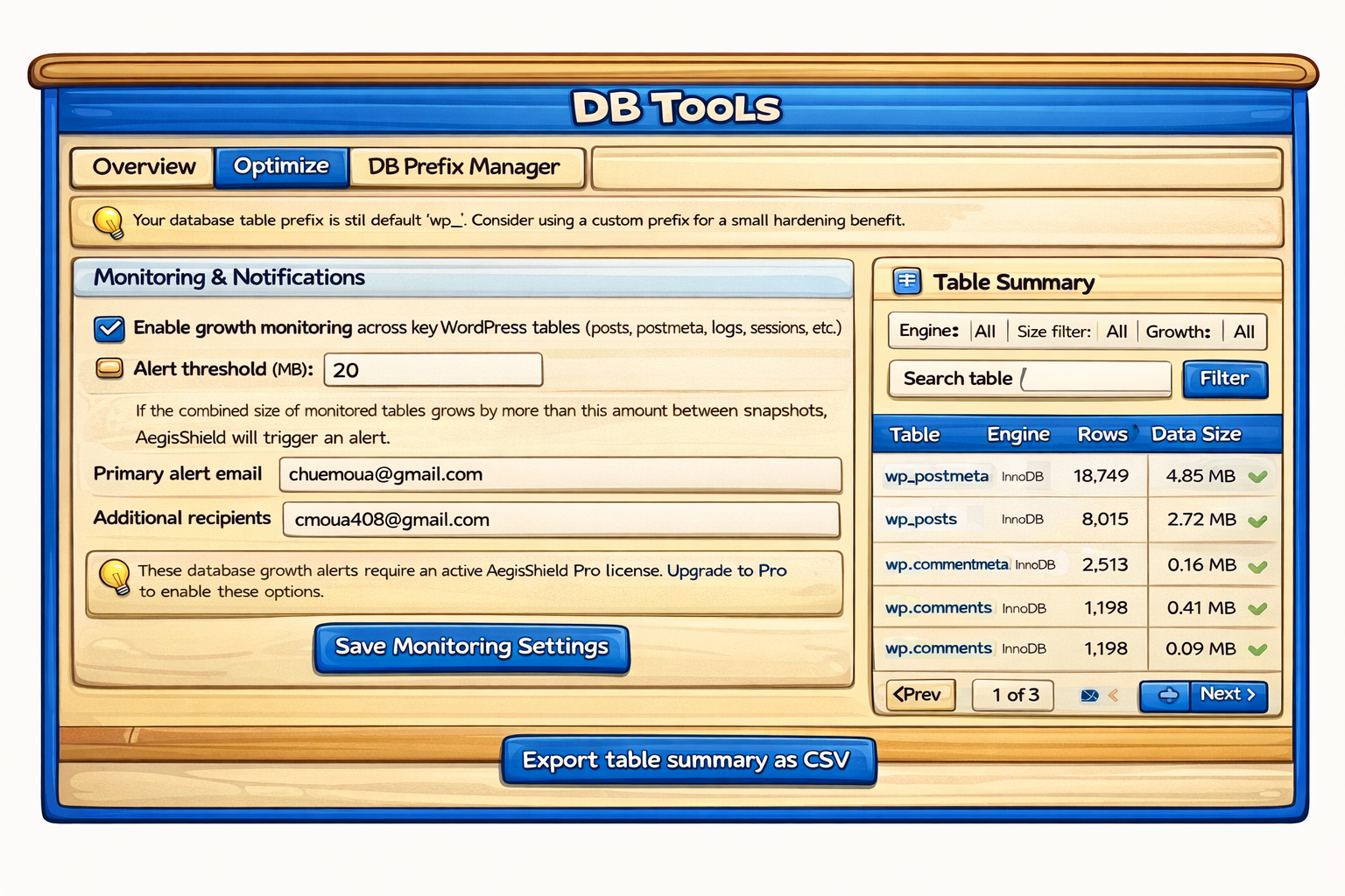 DB Tools Overview acts as the health dashboard for your WordPress database, giving administrators clear visibility into table size, growth trends, and structural signals that often precede performance or security issues. With growth monitoring, configurable alert thresholds, email notifications, and a powerful table summary with filters and CSV export, admins can quickly identify abnormal growth, diagnose root causes, and document database behaviorturning database management from reactive guesswork into proactive control.