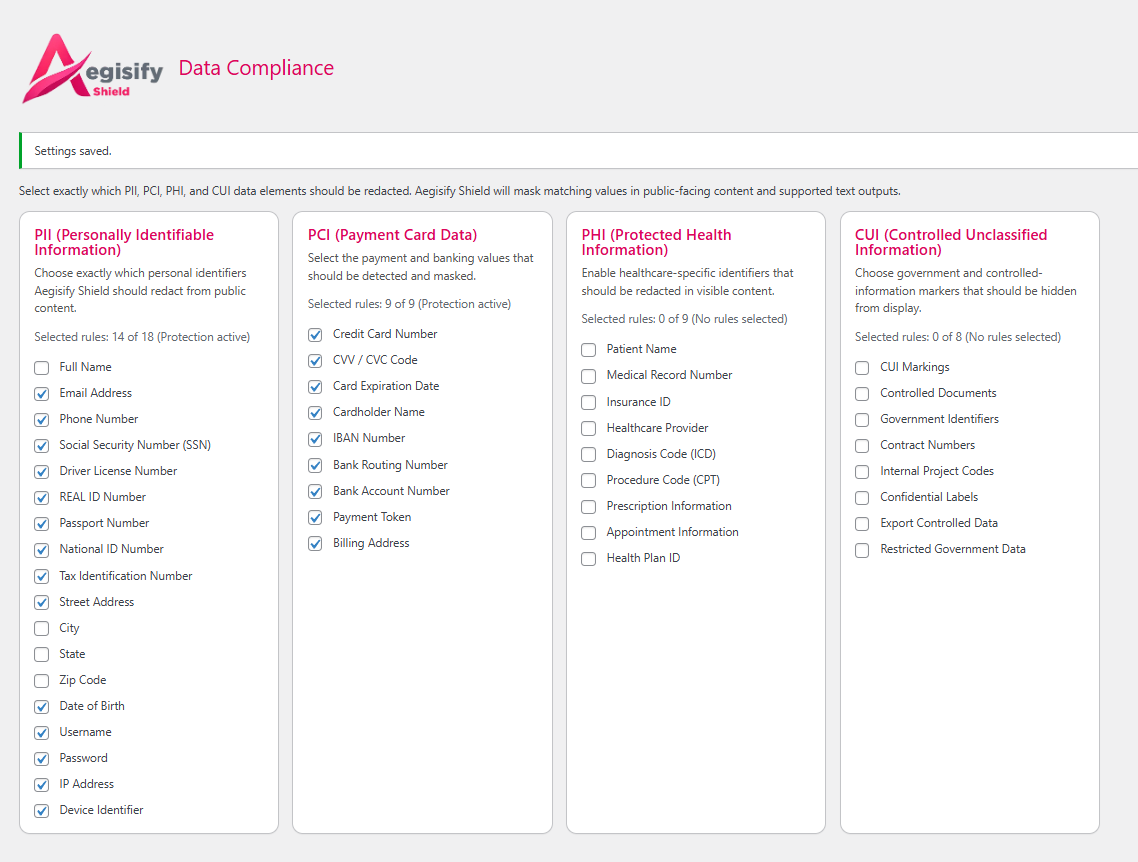 The Data Compliance page within Aegisify Shield gives administrators precise control over how sensitive data is detected and protected across their WordPress environment.